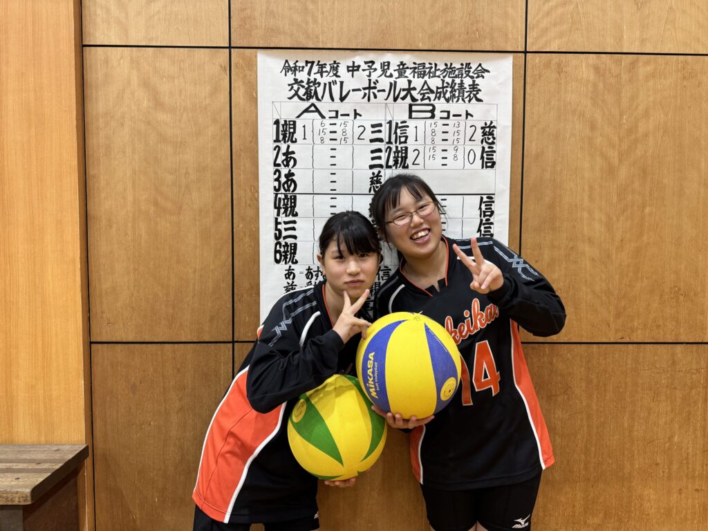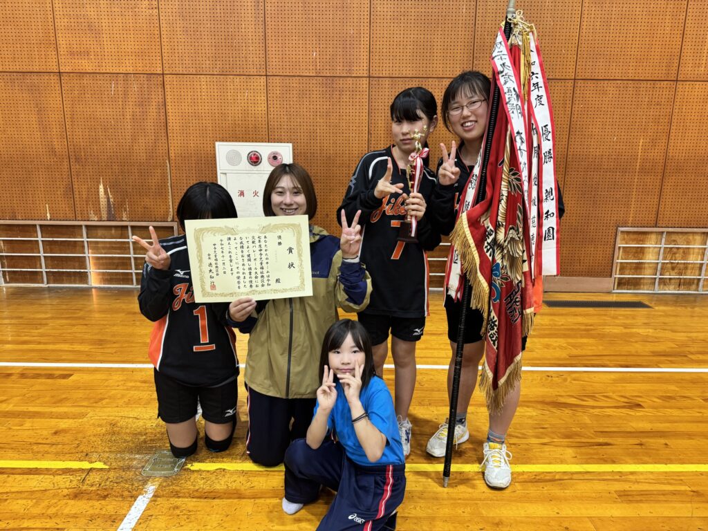 11月2日、粟井小学校にて中予児童福祉施設会交歓バレーボール大会が開催されました。これまでの練習の成果をしっかりと発揮し、どの試合でも最後まであきらめずにボールを追う姿がとても印象的でした。 その結果、見事に優勝!! 最優秀選手賞を受賞した児童もおり、チーム全体で喜びを分かち合いました。ベンチからの大きな声援も力となり、まさに“チーム一丸”で掴んだ優勝です。